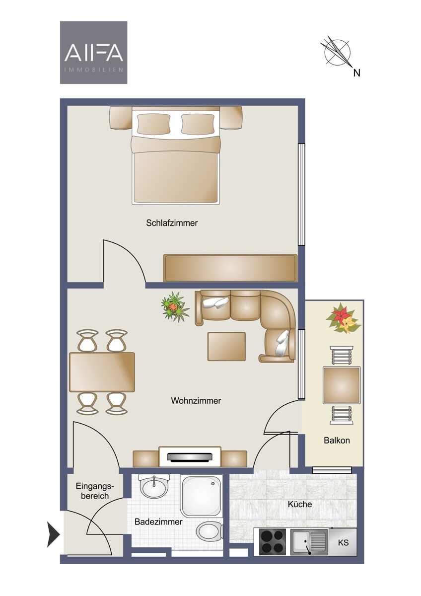 Der Grundriss umfasst insgesamt zwei Zimmer: ein Wohnzimmer mit Zugang zum Balkon, ein separates Schlafzimmer, eine Küche sowie ein Badezimmer mit Dusche. Zusätzlich stehen ein zugeordneter Kellerraum, ein Fahrradkeller und eine Gemeinschaftswaschküche zur Verfügung, die praktischen Stauraum und Komfort bieten. Die Erdgeschosslage sorgt für bequemen Zugang und macht die Wohnung auch langfristig attraktiv für verschiedene Mietergruppen.
